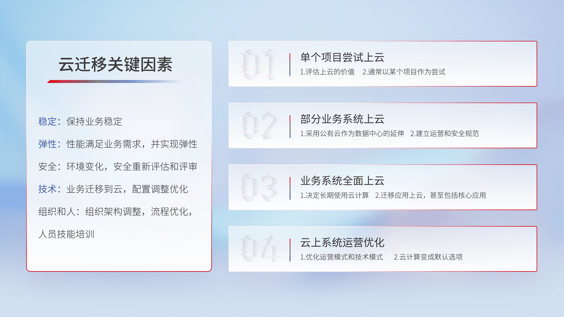 结合实际业务,,,从规划设计、、、云平台选型、、云原生改造、、数据迁移、、、集成交付,,,,迁移全过程为客户识别最佳上云路径,,,,做好风险识别管理,,,设计网络架构、、、身份权限、、安全审计合规、、操作审计、、日志审计、、监控告警策略、、、多站点容灾设计等,,,对云上基础设施进行整体规划,,提升IT治理水平,,,以满足弹性、、高可用、、高性能的需求。。